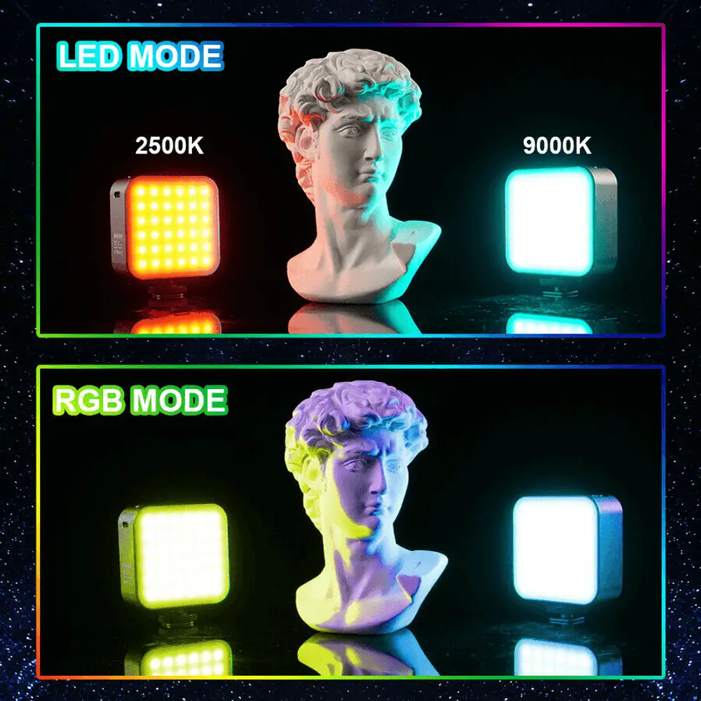 Este Iluminador Led RGB LED-01 Dupla Face Vídeo Light 5W Compacto com Bateria Interna para Câmeras e Filmadoras possui um Design que permite sua luz de preenchimento ser usada dos Dois lados, um lado com 60 LEDs com Temperatura de Cor Bi-Color e o outro com 36 Leds RGB. Operação simples, apenas girar o Iluminador Led para Bi-Color ou RGB ele já é travado, sua base rotativa 360° e ajustável, gira para todos os lados que você quiser podem ser iluminados sem sua remoção.