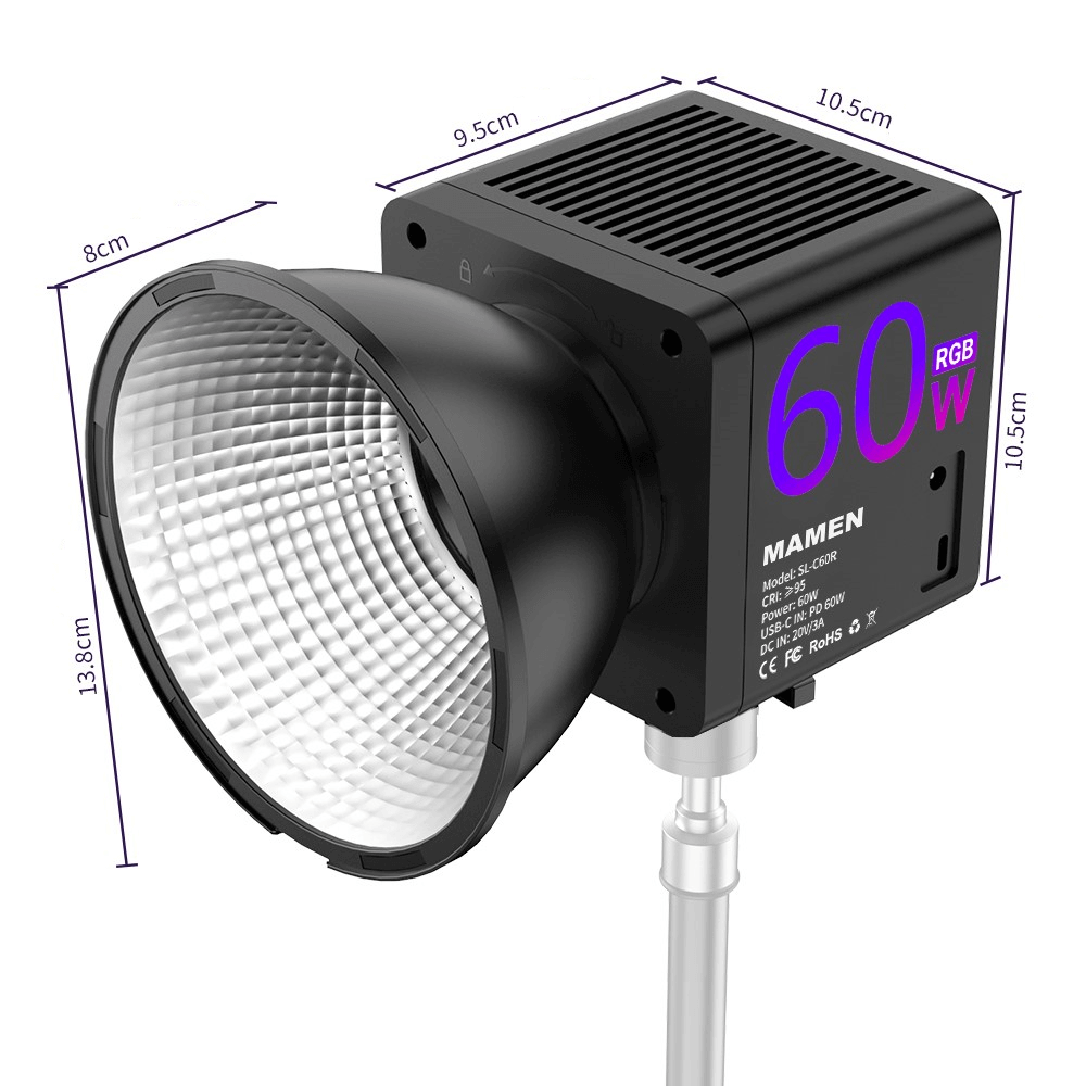 O Mamen SL-C60R apresenta a montagem proprietária Mini Baorong para anexar diferentes modificadores, como o Mini Refletor incluído que aumenta a saída da luz, ou outros modificadores maiores como, snoots, Softbox, Globo Difusor e Beauty Dish (Adaptador de Montagem Bowens Mamen PJ10, não inclusos, vendido separadamente).