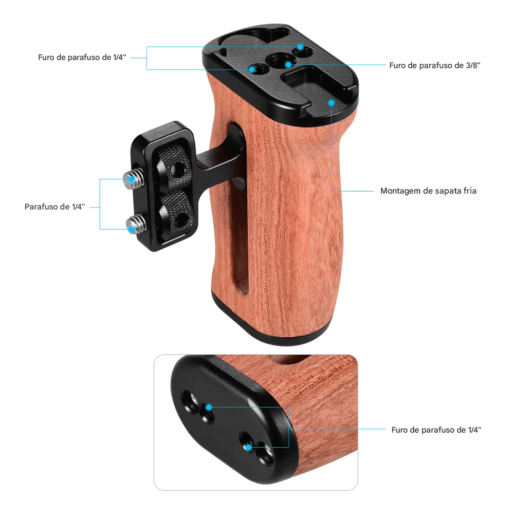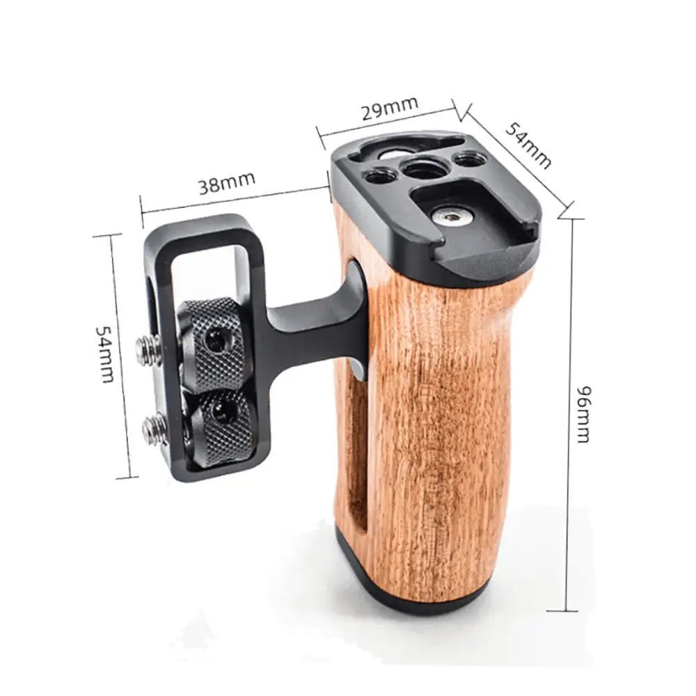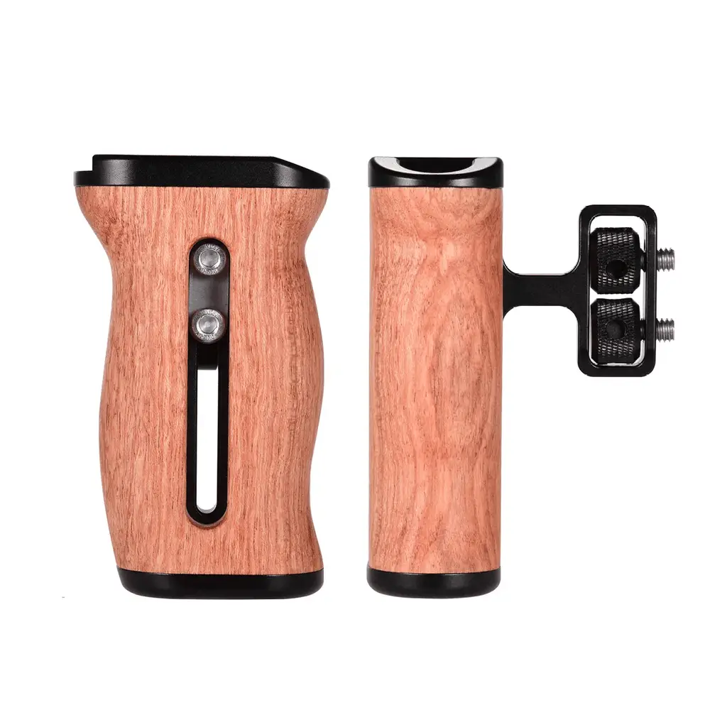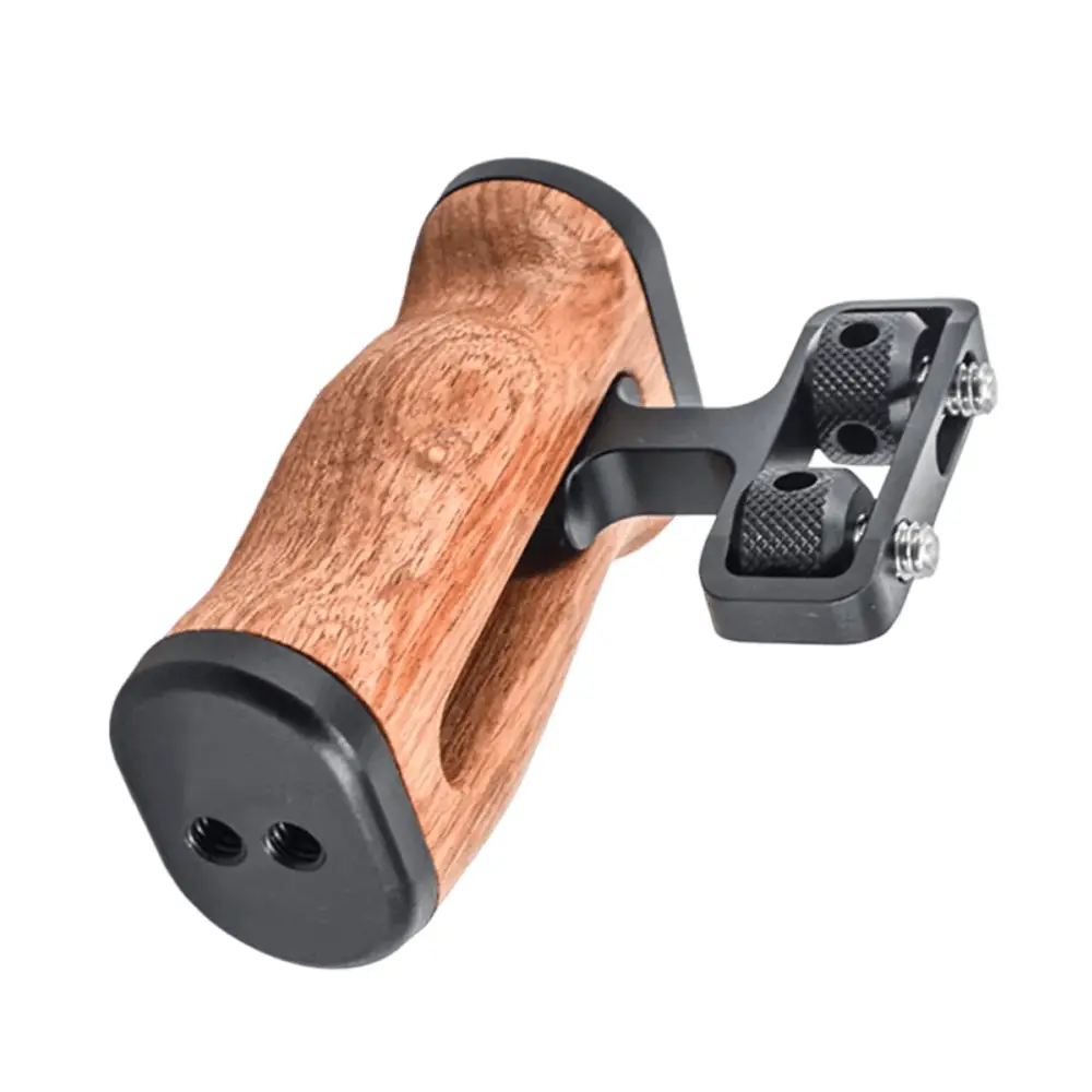 Adicione um Punho Handle Side Grip do lado direito ou esquerdo ao Equipamento ou Gaiola Cage da Câmera com este Punho Handle Lateral Mamen S1-M4 Grip de Madeira para Gaiola Cage (Universal). A parte de alumínio da Alça Punho Handle possui roscas de montagem de 1/4″ e 3/8″, além de uma sapata na parte superior para adicionar iluminadores, microfone, monitor, braço de montagem ou outros acessórios.