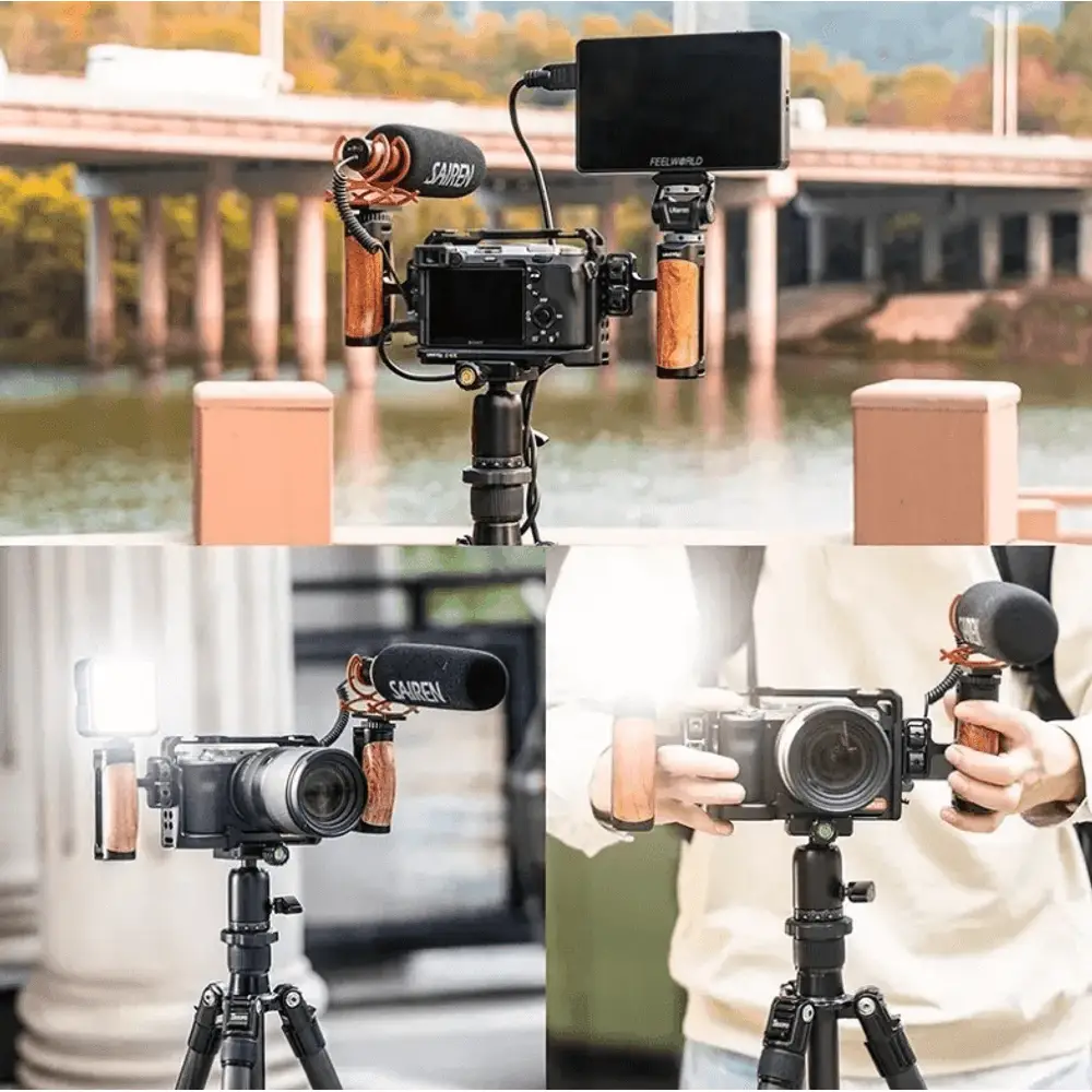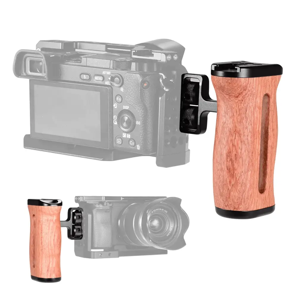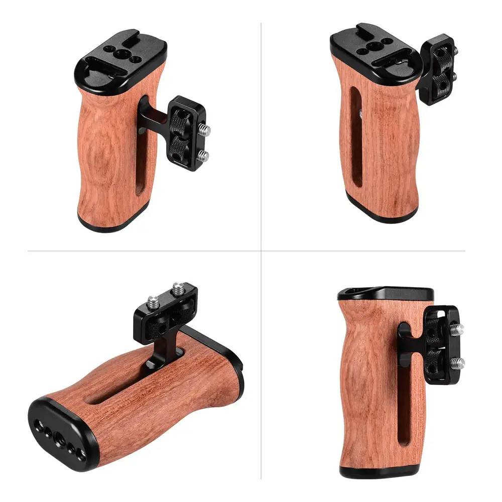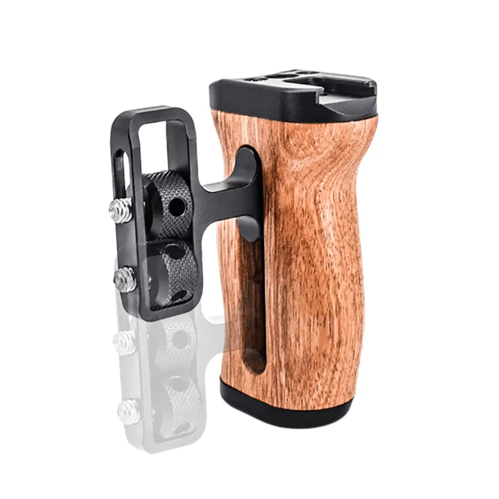Adicione um Punho Handle Side Grip do lado direito ou esquerdo ao Equipamento ou Gaiola Cage da Câmera com este Punho Handle Lateral Mamen S1-M4 Grip de Madeira para Gaiola Cage (Universal). A parte de alumínio da Alça Punho Handle possui roscas de montagem de 1/4″ e 3/8″, além de uma sapata na parte superior para adicionar iluminadores, microfone, monitor, braço de montagem ou outros acessórios.