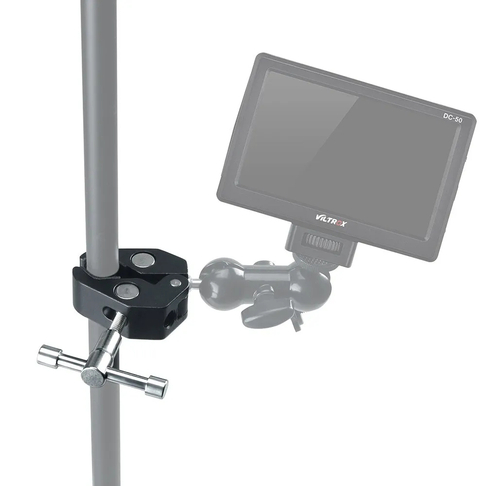 Seu Design ajustável do Suporte Alicate Crab Clamp permite posicionamento preciso e uma abertura máxima de 5.5cm e suporta até 2.5Kg, pode ser fixado de forma firme e conveniente em uma perna de tripé, canos, corrimão, poste, prateleira, mesa, galho e muito mais; proporcionando flexibilidade e opções de personalização para diferentes cenários de fotografia.